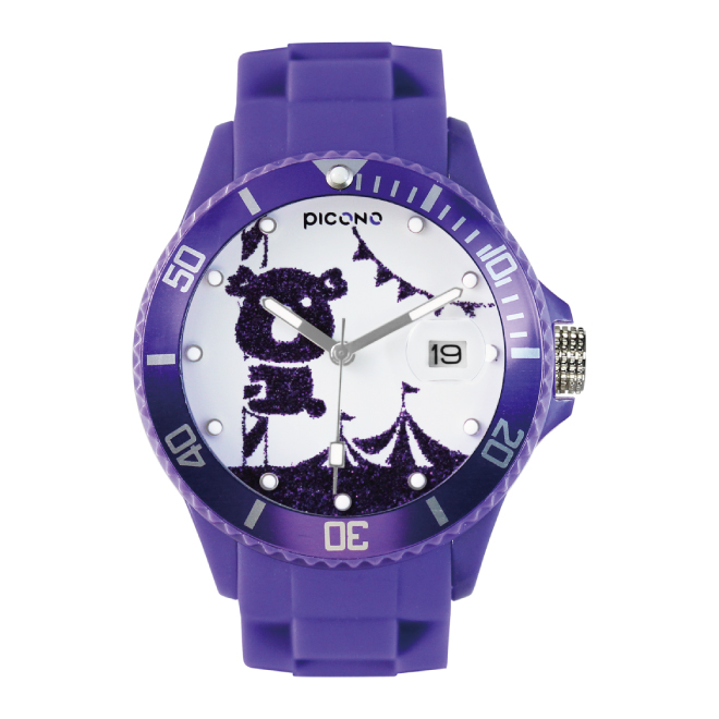 We use Japenese movement with plastic case and rubber band which are perfect for excercicing and casual wear. Using fearless Purple to show the joy from adventures, we draw outlines of animals and facilities in the theme park, with luminous on the hands, to recreate the pure joy in your memory during your childhood.